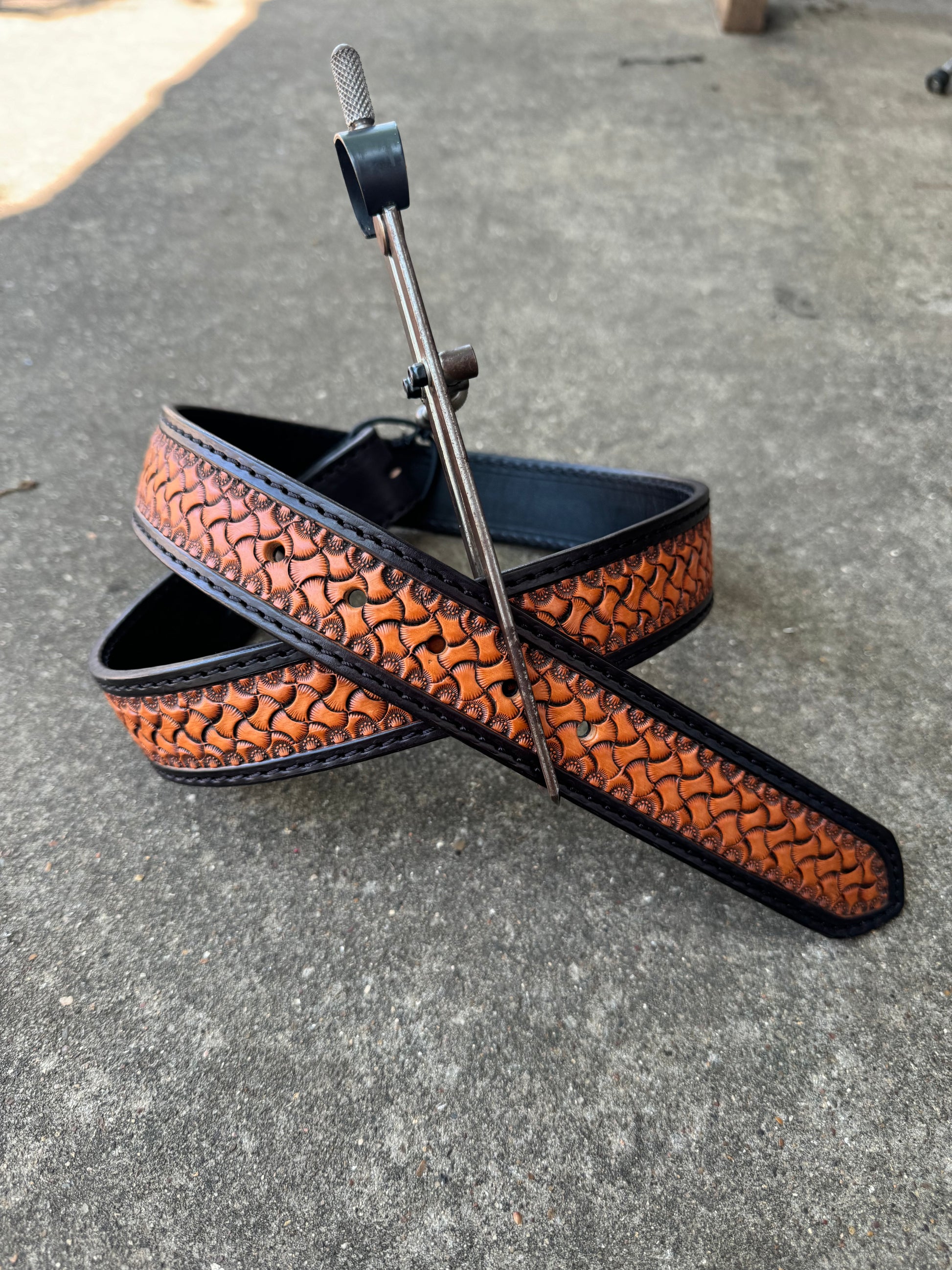 This handmade belt features a Axe Head pattern with a Black Border and Black Stitching.